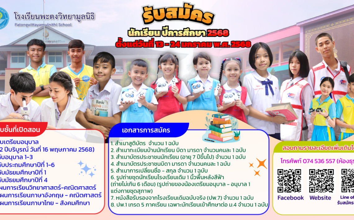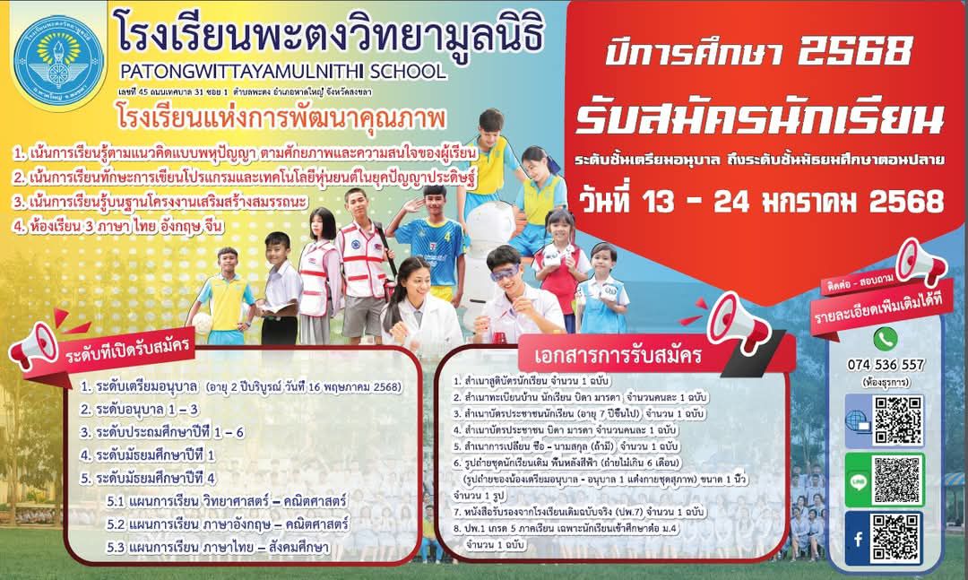 ใกล้รับสมัครแล้วครับ“รับสมัครนักเรียนปีการศึกษา 2568″เพียงแค่เตรียมหลักฐานการสมัครให้พร้อม เดินเข้ามาทุกคนพร้อมให้การต้อนรับไม่มีค่าธรรมเนียมการสมัครรับจำนวนจำกัด มาก่อนได้สิทธิ์ก่อนครับสร้างความรู้ เสริมประสบการณ์ที่ดี หาได้ที่โรงเรียนพะตงวิทยามูลนิธิ