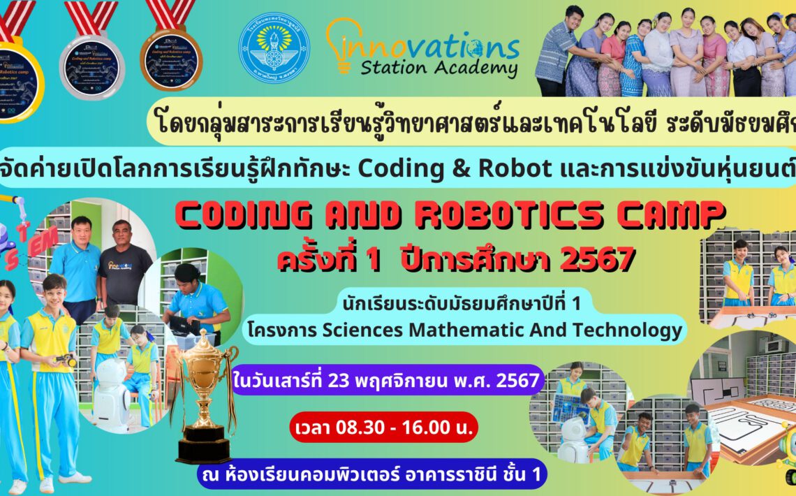 จัดค่ายเปิดโลกการเรียนรู้ฝึกทักษะ Coding & Robot และการแข่งขันหุ่นยนต์ โดยกลุ่มสาระการเรียนรู้วิทยาศาสตร์และเทคโนโลยี ระดับมัธยมศึกษา“Coding and robotics camp”นักเรียนระดับมัธยมศึกษาปีที่ 1โครงการ Sciences Mathematic And Technologyครั้งที่ 1 ปีการศึกษา 2567ในวันเสาร์ที่ 23 พฤศจิกายน พ.ศ. 2567เวลา 08.30 – 16.00 น.ณ ห้องเรียนคอมพิวเตอร์ อาคารราชินี ชั้น 1