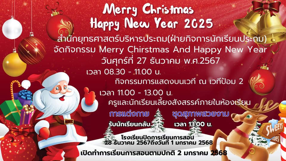 Merry Christmas And Happy New Year 2025🤩สำนักยุทธศาสตร์บริหารประถม(ฝ่ายกิจการนักเรียนประถม)🥰จัดกิจกรรม Merry Chirstmas And Happy New Year 2025วันศุกร์ที่ 27 ธันวาคม พ.ศ.2567เวลา 08.30 – 11.00 น. กิจกรรมการแสดงบนเวที ณ เวทีป้อม 2เวลา 11.00 – 13.00 น. ครูและนักเรียนเลี้ยงสังสรรค์ภายในห้องเรียน👗การแต่งกาย ชุดสุภาพสวยงาม⏰รับนักเรียนกลับ เวลา 13.00 น.❌โรงเรียนปิดการเรียนการสอน28 ธันวาคม 2567ถึงวันที่ 1 มกราคม 2568✅เปิดทำการเรียนการสอนตามปกติ 2 มกราคม 2568
