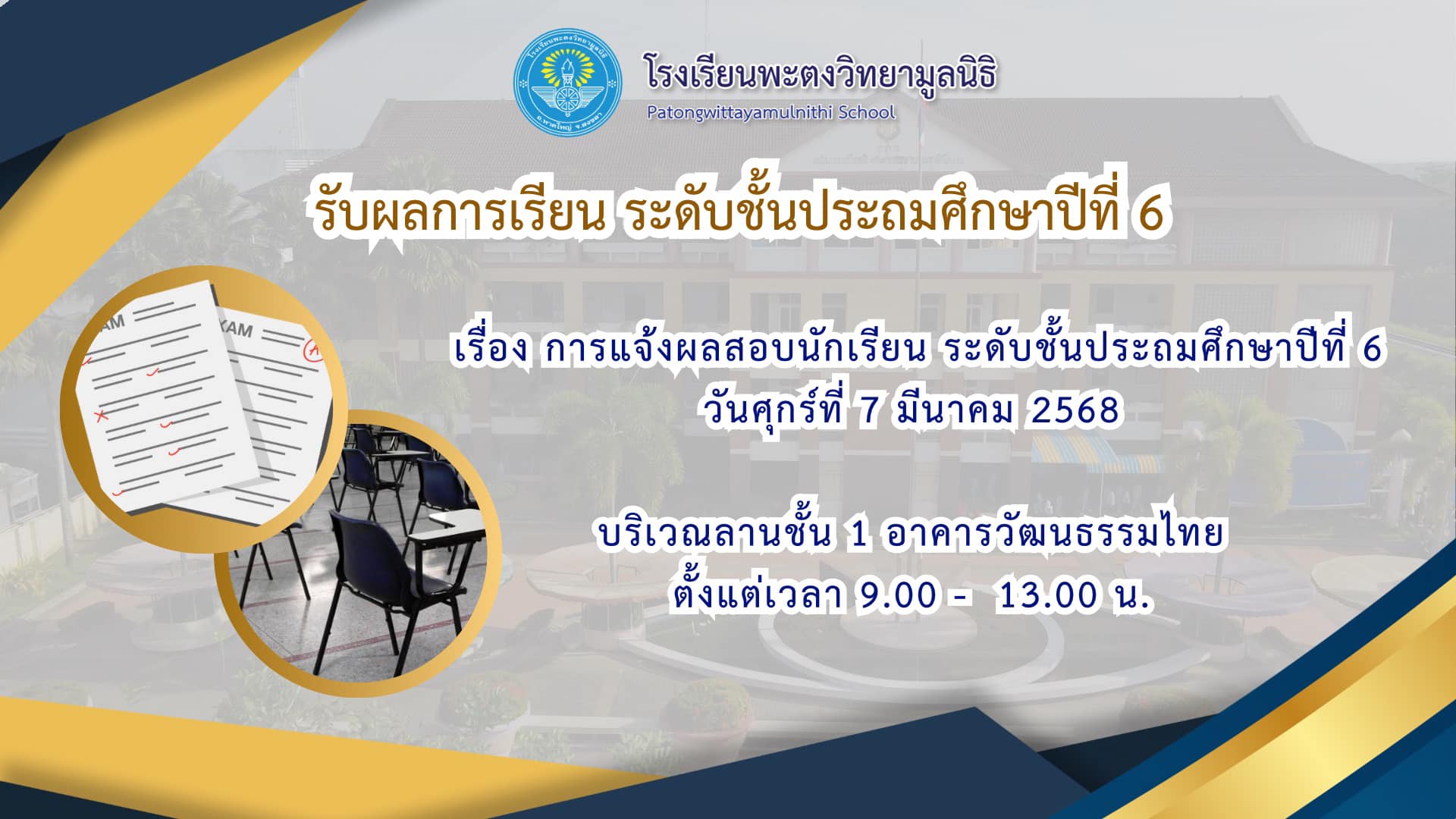 เรื่อง การแจ้งผลสอบนักเรียน ระดับชั้นประถมศึกษาปีที่ 6
